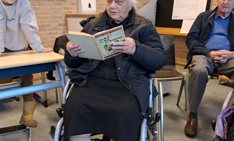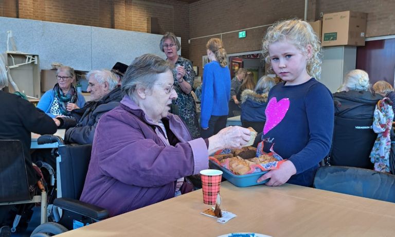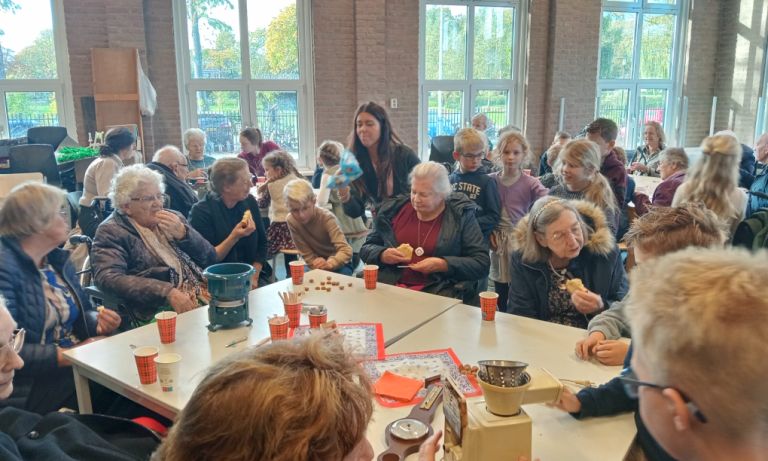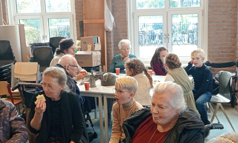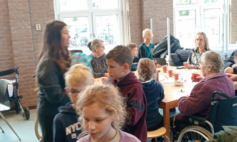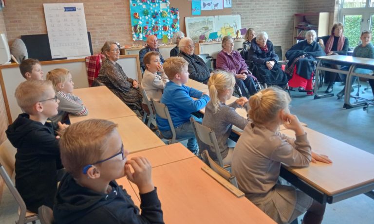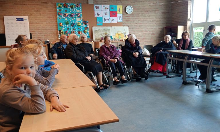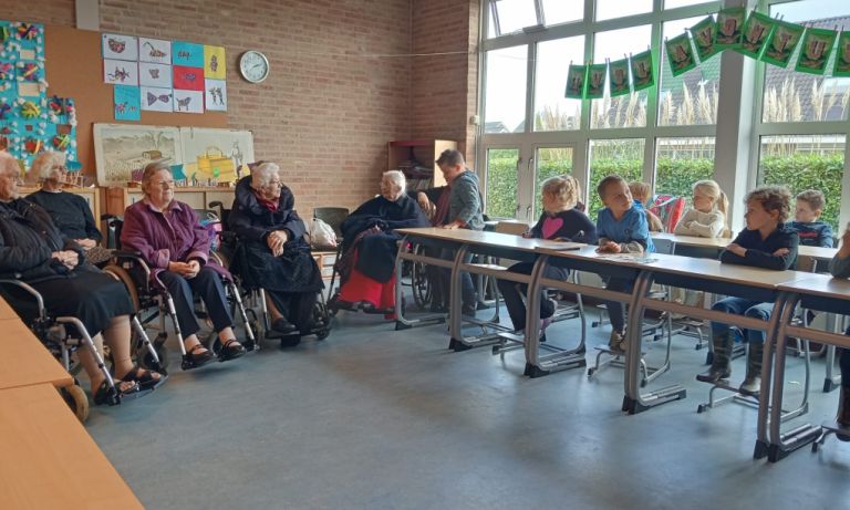 27 oktober 2025 , 15:30 uurHoog bezoek in groep 4b en 5a! Enkele ouderen vanuit 't Slot kwamen op bezoek. We hebben met elkaar gezongen en er is voorgelezen. Natuurlijk zorgden wij ook voor een kopje koffie of thee met een lekkere plak cake erbij. Wat hebben wij van het bezoek genoten! En de ouderen ook, zij wilden elke maand wel terugkomen... :)